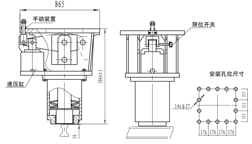 主要設計特點: 常閉式設計、採(cai)用液壓站集中驅動控製以特製(zhi)碟形彈簧實現頂軌製動; 摩擦塊採用(yong)先進的高耐磨鋼,性能可(ke)靠; 設有限位開關,顯(xian)示工作狀態; 帶手動釋放(fang),安裝維護方便。